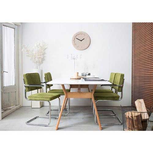 De Ridge serie van Zuiver heeft zoveel verschillende opties dat je je stoel helemaal naar wens kan samenstellen. Zo zijn er eetkamerstoelen, loungestoelen en barkrukken. Bij de eetkamerstoelen kan je ook nog kiezen of je wel of geen armleuningen wilt. Vervolgens kan je kiezen uit verschillende stoffen en kleuren. Uiteindelijk lijkt het wel alsof deze stoel op bestelling gemaakt wordt. Deze variant heeft armleuningen en de stof is ribcord.